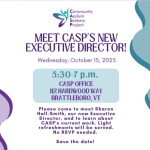 Please come meet Sharon Hall-Smith, our new Executive Director, and to learn about CASP’s current work. Light refreshments will be served. No RSVP needed. Date: Wednesday, October 15th 2025 Time: 5:30 PM – 7:30 PM Address: CASP Office: 112 Hardwood Way Brattleboro, VT Save the date! We look forward to seeing you there!